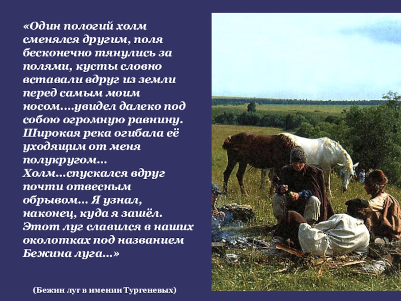 тянулись за полями, кусты словно вставали вдруг из земли перед самым моим носом.…увидел далеко под собою огромную равнину. Широкая река огибала её уходящим от меня полукругом… Холм…спускался вдруг почти отвесным обрывом… Я узнал, наконец, куда я зашёл. Этот луг славился в наших околотках под названием Бежина луга…»