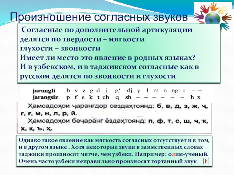 Однако такое явление как мягкость согласных отсутствует и в том, и в другом языке . Хотя некоторые звуки в заимственных словах таджики произносят мягче, чем узбеки. Например: олим-ученый. Очень часто узбеки неправильно произносят гортанный звук [h]