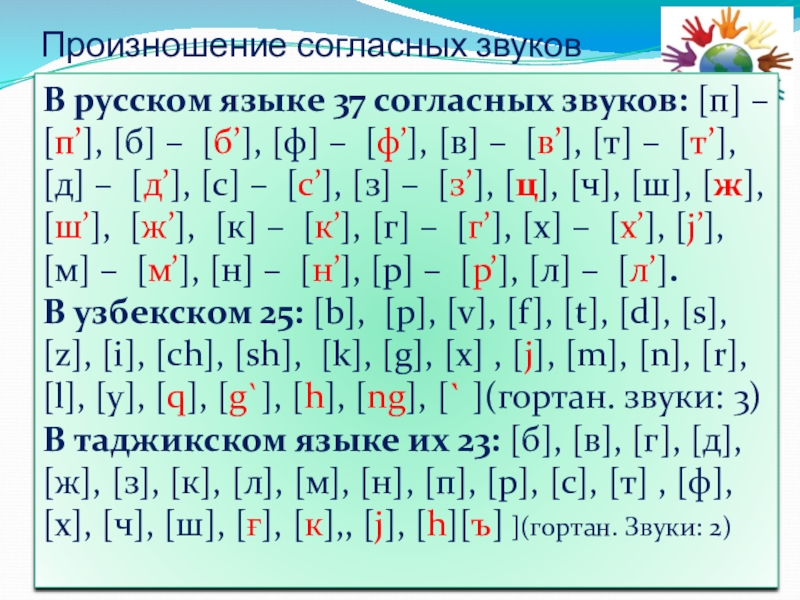 [п’], [б] – [б’], [ф] – [ф’], [в] – [в’], [т] – [т’], [д] – [д’], [с] – [с’], [з] – [з’], [ц], [ч], [ш], [ж], [ш’], [ж’], [к] – [к’], [г] – [г’], [х] – [х’], [j’], [м] – [м’], [н] – [н’], [р] – [р’], [л] – [л’].