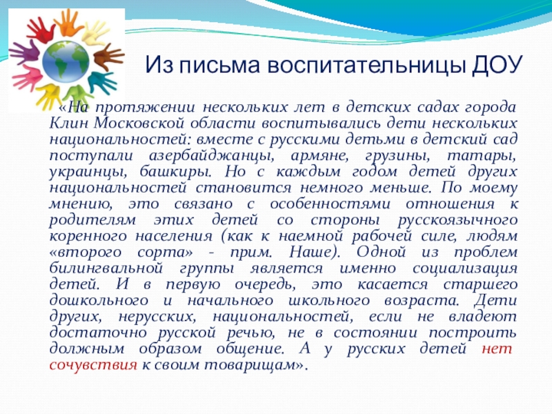 «На протяжении нескольких лет в детских садах города Клин Московской области воспитывались дети нескольких национальностей: вместе с русскими детьми в детский сад поступали азербайджанцы, армяне, грузины, татары, украинцы, башкиры. Но с каждым годом детей других национальностей становится немного меньше. По моему мнению, это связано с особенностями отношения к родителям этих детей со стороны русскоязычного коренного населения (как к наемной рабочей силе, людям «второго сорта» - прим. Наше). Одной из проблем билингвальной группы является именно социализация детей. И в первую очередь, это касается старшего дошкольного и начального школьного возраста. Дети других, нерусских, национальностей, если не владеют достаточно русской речью, не в состоянии построить должным образом общение. А у русских детей нет сочувствия к своим товарищам».
