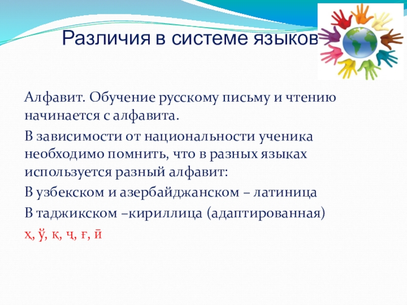 В зависимости от национальности ученика необходимо помнить, что в разных языках используется разный алфавит: