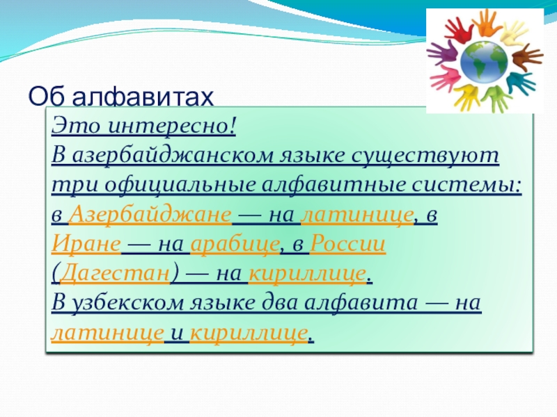 в Азербайджане — на латинице, в Иране — на арабице, в России (Дагестан) — на кириллице.