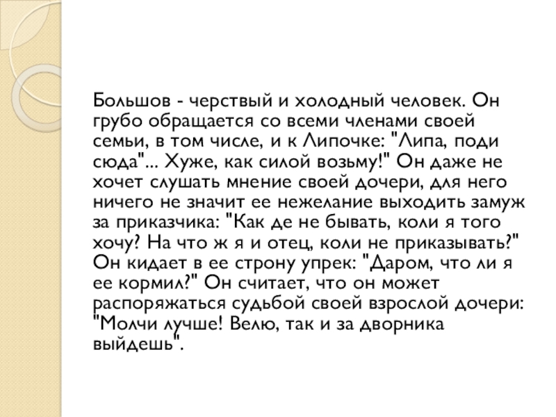 Слайд 17Большов - черствый и холодный человек. Он грубо обращается со всеми