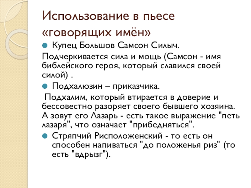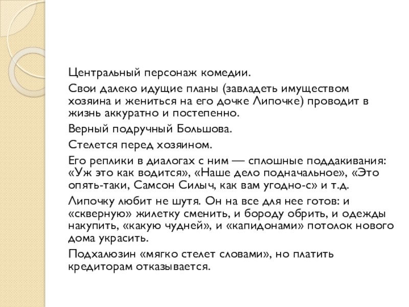 Его реплики в диалогах с ним — сплошные поддакивания: «Уж это как водится», «Наше дело подначальное», «Это опять-таки, Самсон Силыч, как вам угодно-с» и т.д.