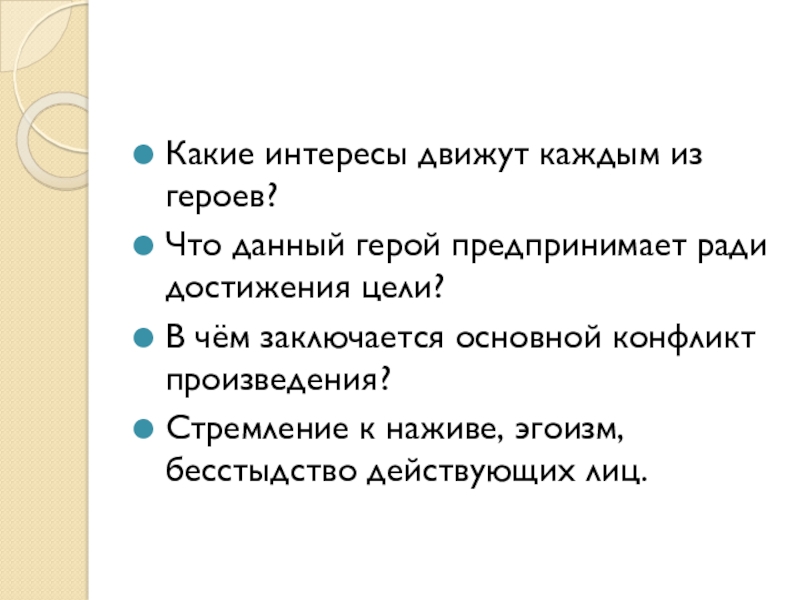 Стремление к наживе, эгоизм, бесстыдство действующих лиц.