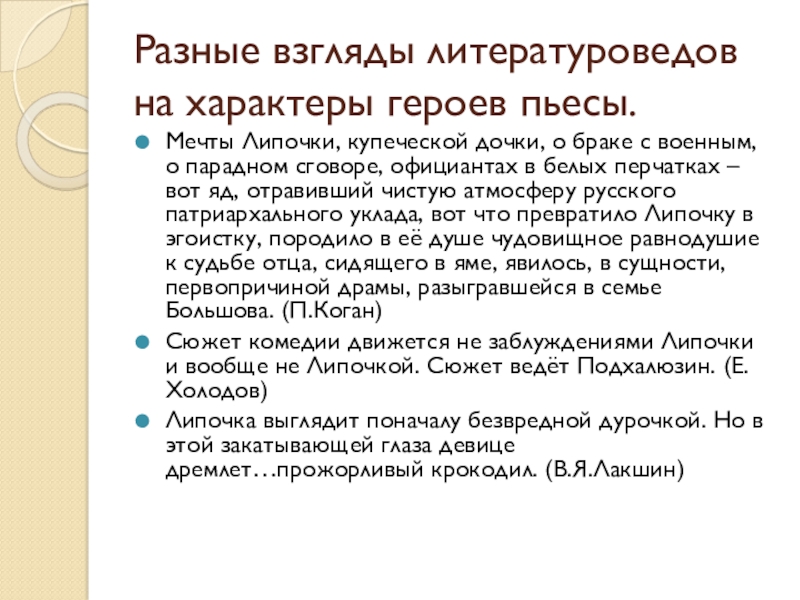 Слайд 23Разные взгляды литературоведов на характеры героев пьесы.