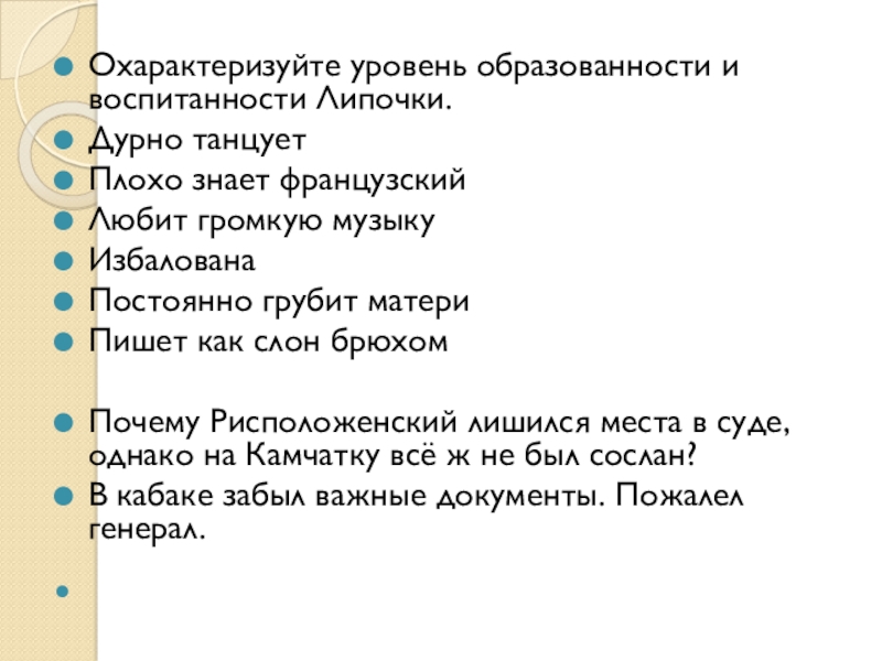 Слайд 5Охарактеризуйте уровень образованности и воспитанности Липочки.