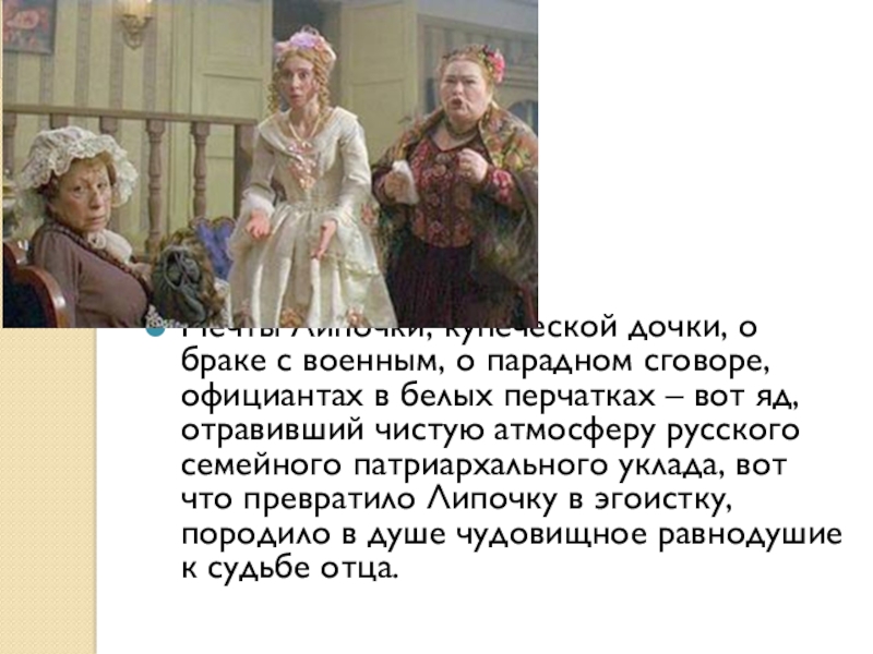 Мечты Липочки, купеческой дочки, о браке с военным, о парадном сговоре, официантах в белых перчатках – вот яд, отравивший чистую атмосферу русского семейного патриархального уклада, вот что превратило Липочку в эгоистку, породило в душе чудовищное равнодушие к судьбе отца.