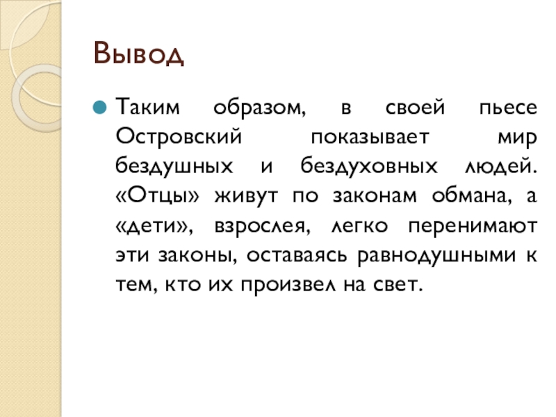 Таким образом, в своей пьесе Островский показывает мир бездушных и бездуховных