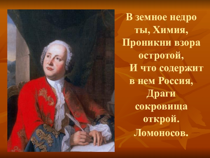 В земное недро ты, Химия, Проникни взора остротой, И что содержит в нем Россия, Драги сокровища открой. Ломоносов.