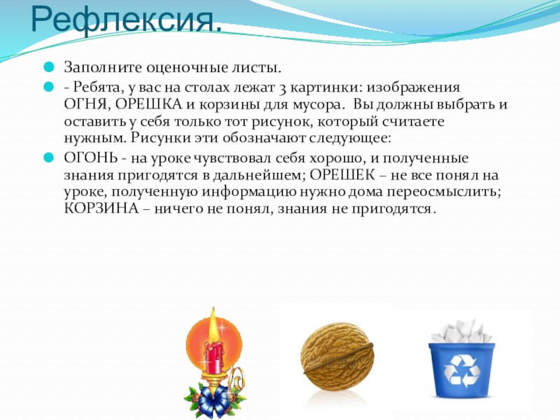 ОГОНЬ - на уроке чувствовал себя хорошо, и полученные знания пригодятся в дальнейшем; ОРЕШЕК – не все понял на уроке, полученную информацию нужно дома переосмыслить; КОРЗИНА – ничего не понял, знания не пригодятся.