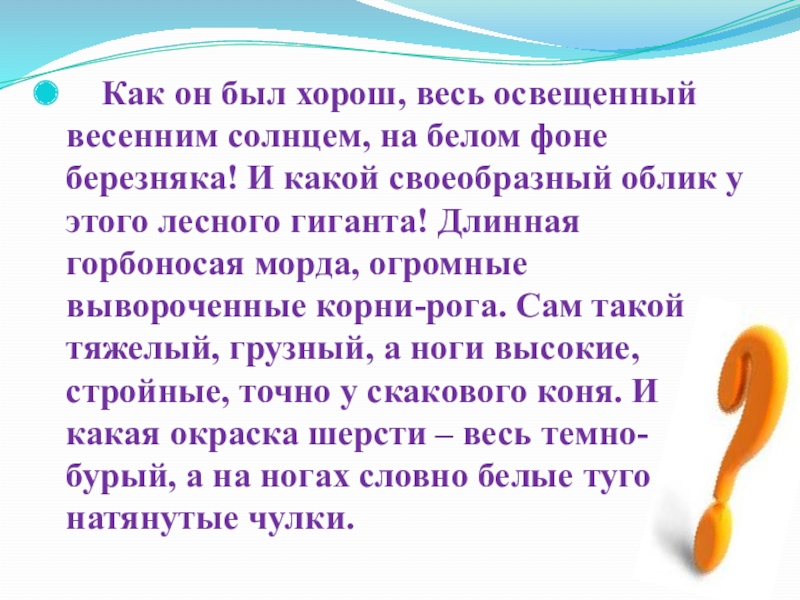 белом фоне березняка! И какой своеобразный облик у этого лесного гиганта! Длинная горбоносая морда, огромные вывороченные корни-рога. Сам такой тяжелый, грузный, а ноги высокие, стройные, точно у скакового коня. И какая окраска шерсти – весь темно-бурый, а на ногах словно белые туго натянутые чулки.