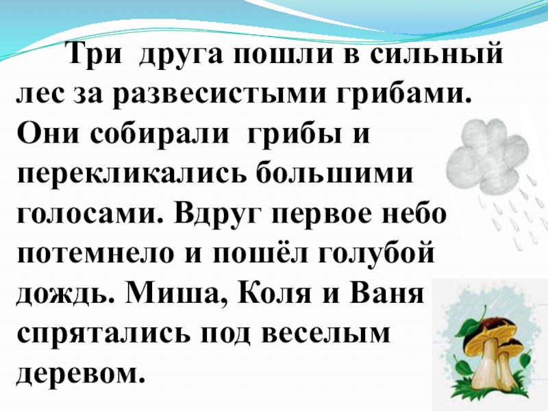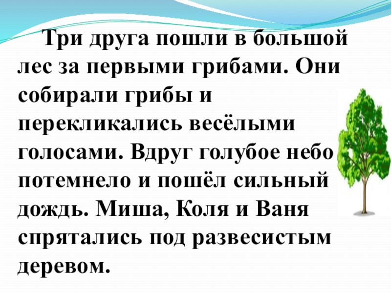 Они собирали грибы и перекликались весёлыми голосами. Вдруг голубое небо потемнело и пошёл сильный дождь. Миша, Коля и Ваня спрятались под развесистым деревом.