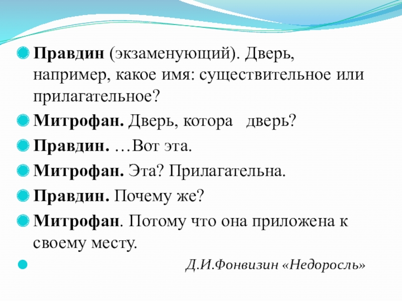 Слайд 6Правдин (экзаменующий). Дверь, например, какое имя: существительное или прилагательное?