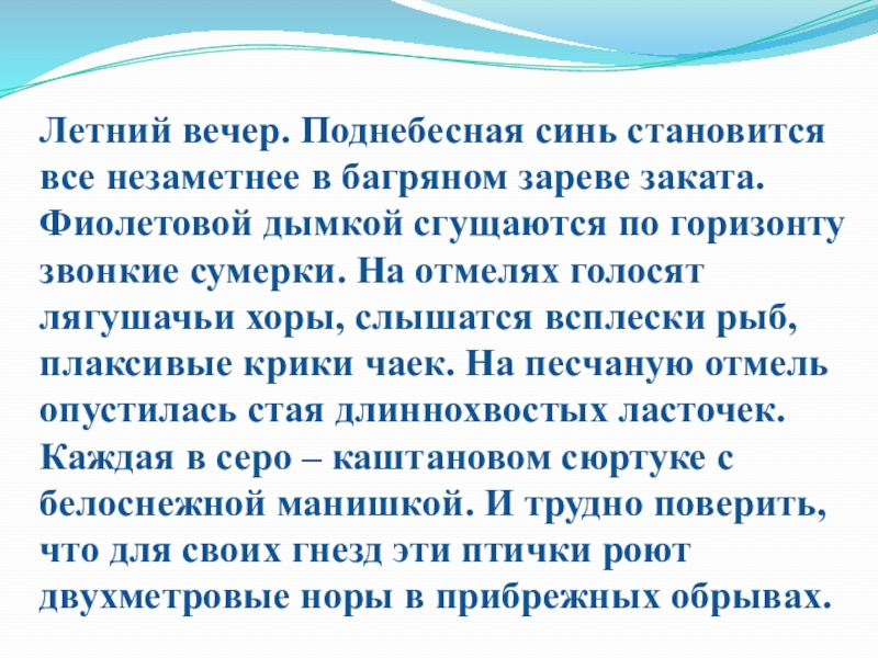 багряном зареве заката. Фиолетовой дымкой сгущаются по горизонту звонкие сумерки. На отмелях голосят лягушачьи хоры, слышатся всплески рыб, плаксивые крики чаек. На песчаную отмель опустилась стая длиннохвостых ласточек. Каждая в серо – каштановом сюртуке с белоснежной манишкой. И трудно поверить, что для своих гнезд эти птички роют двухметровые норы в прибрежных обрывах.