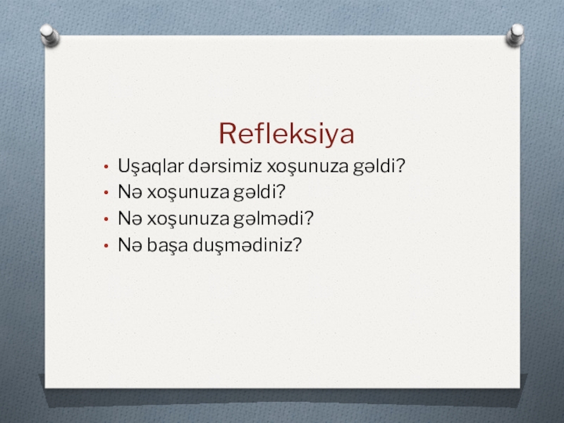 RefleksiyaUşaqlar dərsimiz xoşunuza gəldi?Nə xoşunuza gəldi?Nə xoşunuza gəlmədi?Nə başa duşmədiniz?