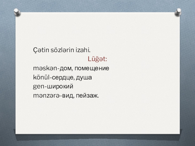 Çətin sözlərin izahi.Lüğət:məskən-дом, помещениеkönül-сердце, душаgen-широкий mənzərə-вид, пейзаж.