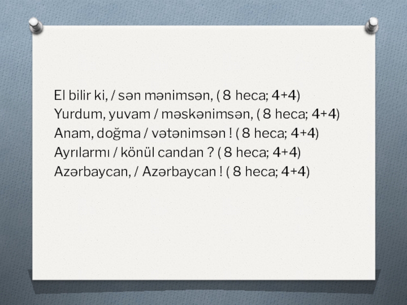 Слайд 6El bilir ki, / sən mənimsən, ( 8 heca; 4+4)