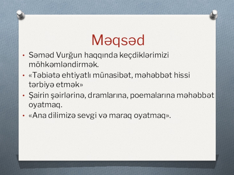 MəqsədSəməd Vurğun haqqında keçdiklərimizi möhkəmləndirmək.«Təbiətə ehtiyatlı münasibət, məhəbbət hissi tərbiyə etmək»Şairin şəirlərinə, dramlarına, poemalarına məhəbbət oyatmaq.«Ana dilimizə