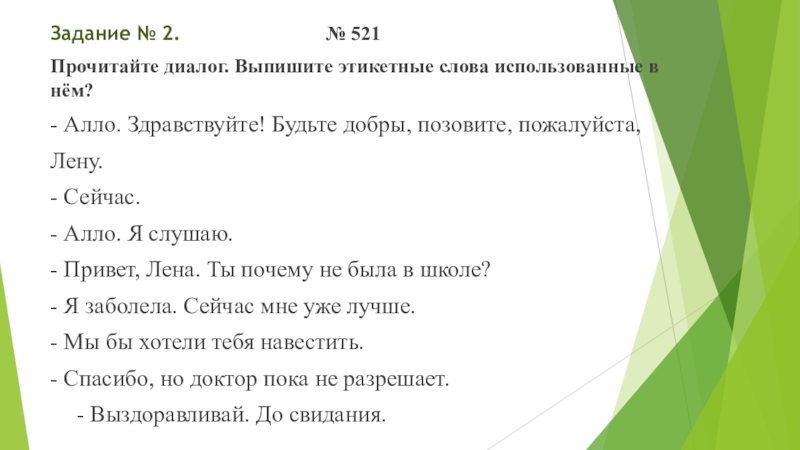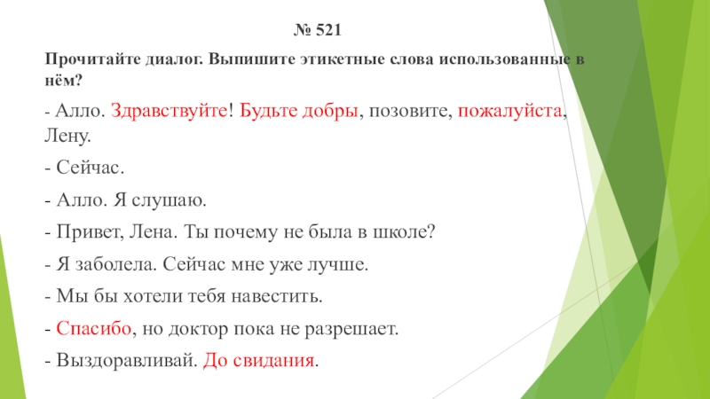 № 521Прочитайте диалог. Выпишите этикетные слова использованные в нём?- Алло. Здравствуйте! Будьте добры, позовите, пожалуйста, Лену.-