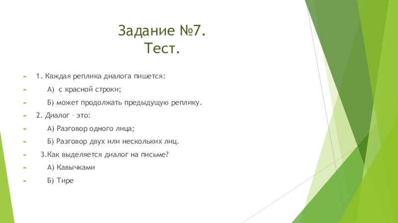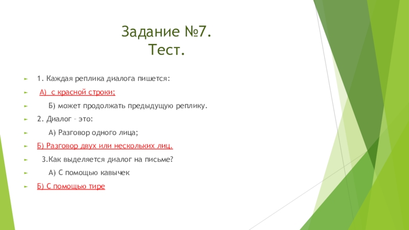 Задание №7. Тест.1. Каждая реплика диалога пишется: А) с красной строки;   Б) может продолжать предыдущую