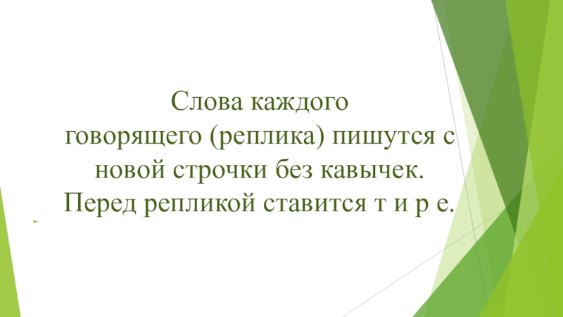 Слайд 7Слова каждого говорящего (реплика) пишутся с новой строчки без кавычек. Перед репликой ставится