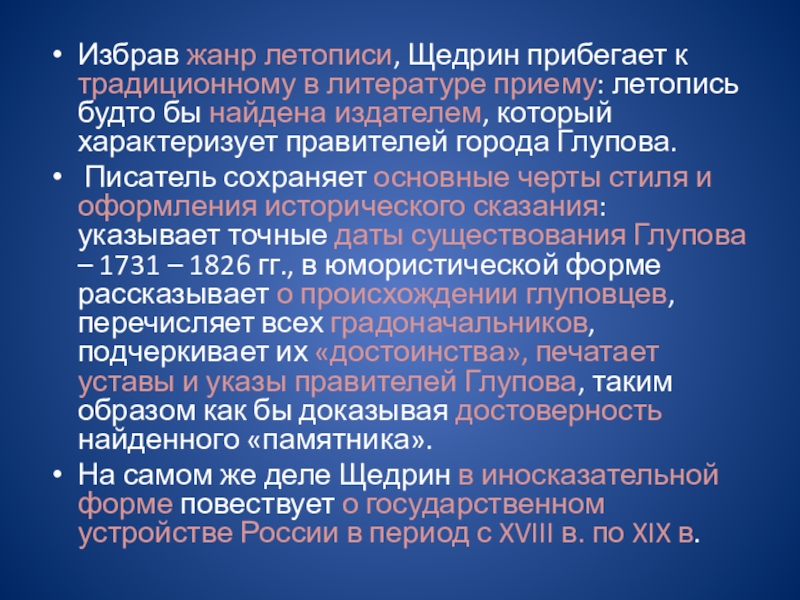 Слайд 8Избрав жанр летописи, Щедрин прибегает к традиционному в литературе приему: летопись