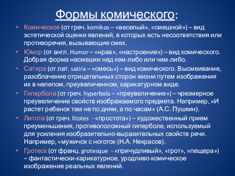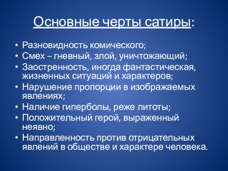 Сатира (от лат. satira – «смесь») – вид комического. Высмеивание, разоблачение отрицательных сторон жизни путем изображения их в нелепом, преувеличенном, карикатурном виде.