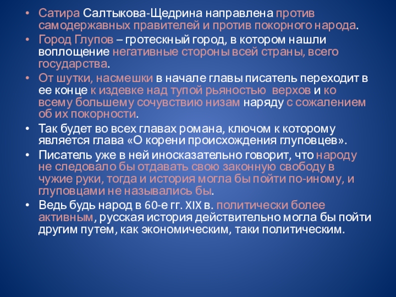 читателе горького чувства, а отнюдь не весёлонравия… я совсем не историю предаю осмеянию, а известный порядок вещей» (М.Е. Салтыков-Щедрин).