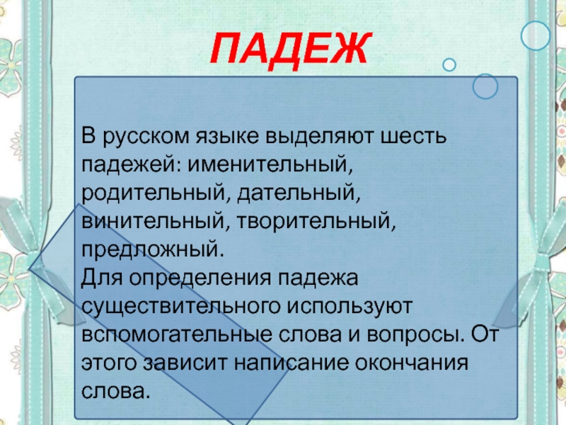 ПАДЕЖВ русском языке выделяют шесть падежей: именительный, родительный, дательный, винительный, творительный, предложный. Для определения падежа существительного используют