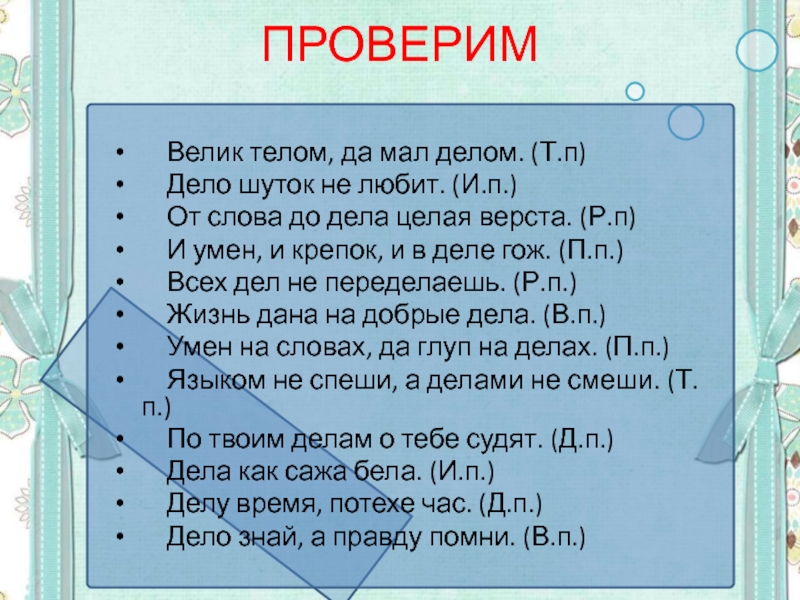 ПРОВЕРИМ  Велик телом, да мал делом. (Т.п)  Дело шуток не любит. (И.п.)  От слова