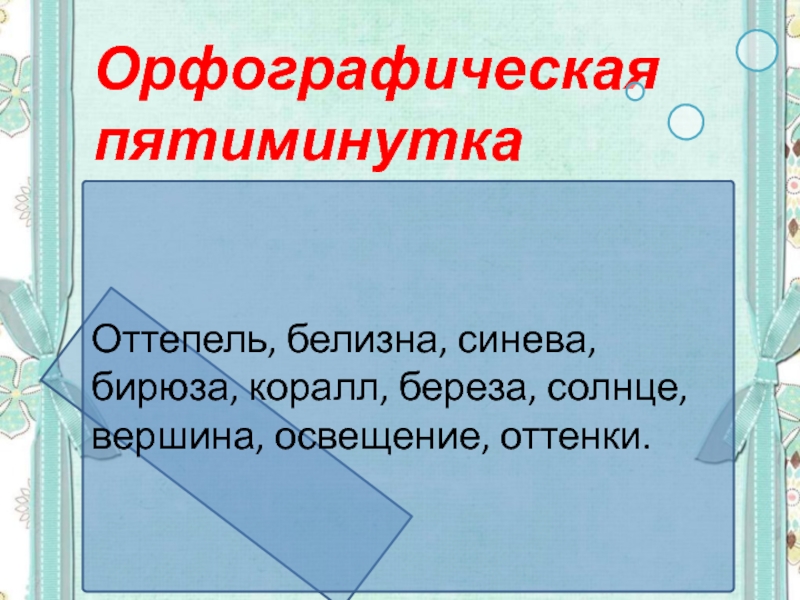 Орфографическая пятиминуткаОттепель, белизна, синева, бирюза, коралл, береза, солнце, вершина, освещение, оттенки.