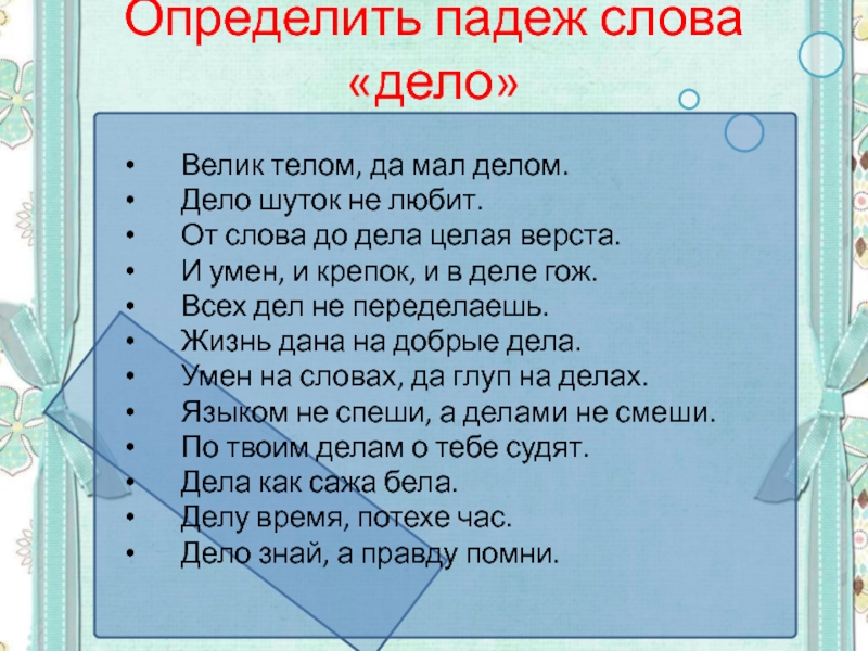 Определить падеж слова «дело»  Велик телом, да мал делом.  Дело шуток не любит.