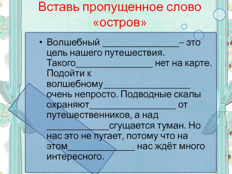 Вставь пропущенное слово «остров»Волшебный ________________– это цель нашего путешествия. Такого________________ нет на карте. Подойти к волшебному__________________ очень