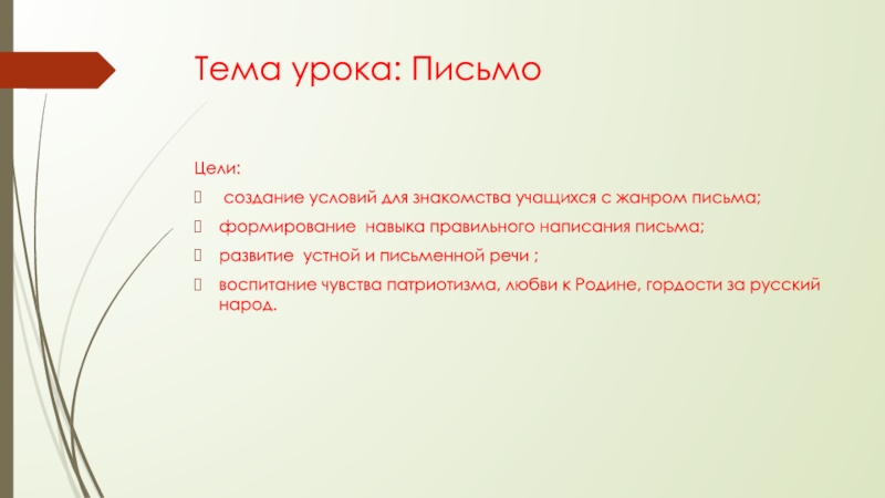Тема урока: Письмо Цели: создание условий для знакомства учащихся с жанром письма;формирование навыка правильного написания письма;развитие устной