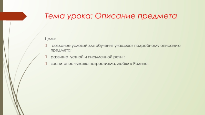 Тема урока: Описание предметаЦели: создание условий для обучения учащихся подробному описанию предмета;развитие устной и письменной речи ;воспитание чувства патриотизма, любви к Родине.