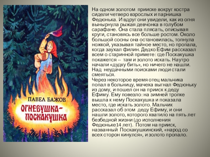 Федюнька. И вдруг они увидели, как из огня вынырнула рыжая девчонка в голубом сарафане. Она стала плясать, описывая круги, становясь все больше ростом. Около большой сосны она остановилась, топнула ножкой, указывая тайное место, но пропала, когда заухал филин. Дедко Ефим рассказал всем о старинной примете: где Поскакушка покажется -- там и золото искать. Наутро начали «дудку бить», но ничего не нашли. Над неудачными поисками люди стали смеяться.