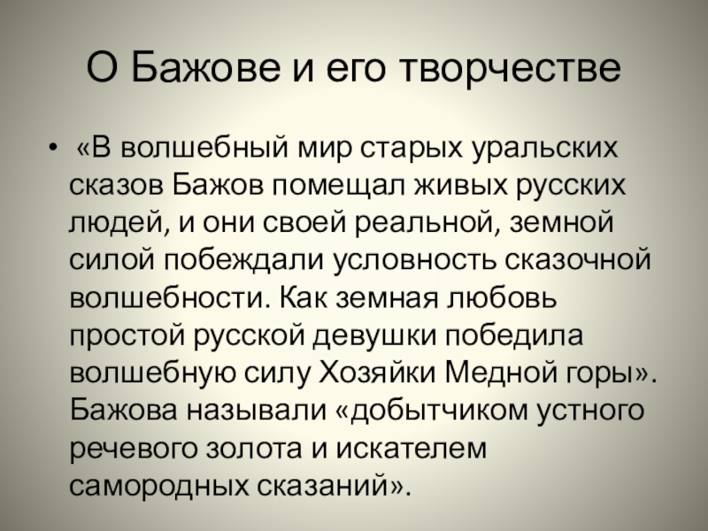помещал живых русских людей, и они своей реальной, земной силой побеждали условность сказочной волшебности. Как земная любовь простой русской девушки победила волшебную силу Хозяйки Медной горы». Бажова называли «добытчиком устного речевого золота и искателем самородных сказаний».