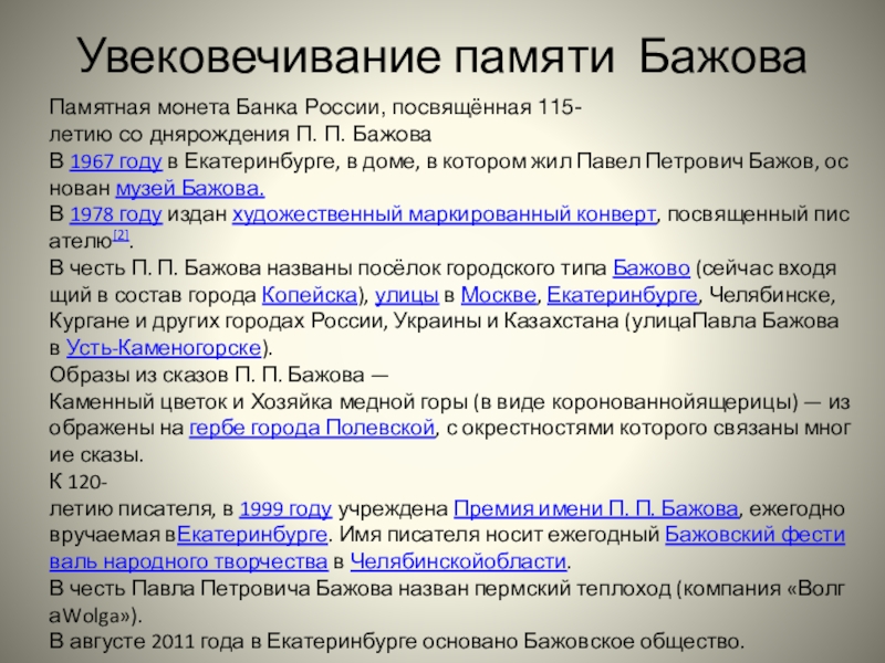 Слайд 21Памятная монета Банка России, посвящённая 115-летию со днярождения П. П. Бажова В 1967 году в Екатеринбурге, в доме, в котором жил Павел Петрович Бажов, основан музей Бажова.