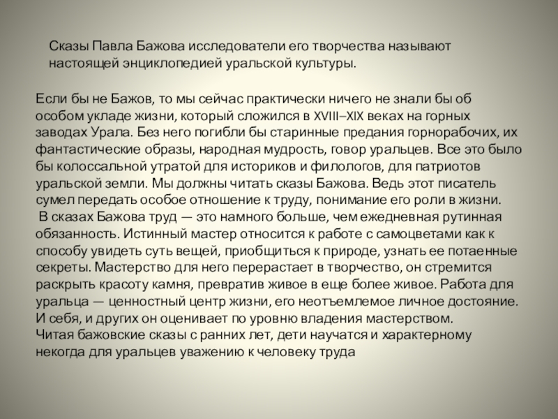 бы не Бажов, то мы сейчас практически ничего не знали бы об особом укладе жизни, который сложился в XVIII–XIX веках на горных заводах Урала. Без него погибли бы старинные предания горнорабочих, их фантастические образы, народная мудрость, говор уральцев. Все это было бы колоссальной утратой для историков и филологов, для патриотов уральской земли. Мы должны читать сказы Бажова. Ведь этот писатель сумел передать особое отношение к труду, понимание его роли в жизни.