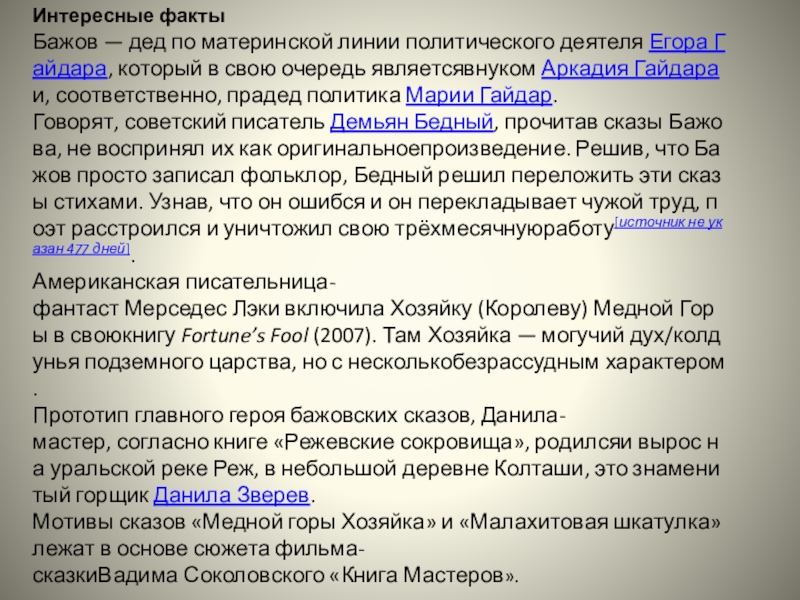 Слайд 24Сказы Павла Бажова исследователи его творчества называют настоящей энциклопедией уральской культуры.