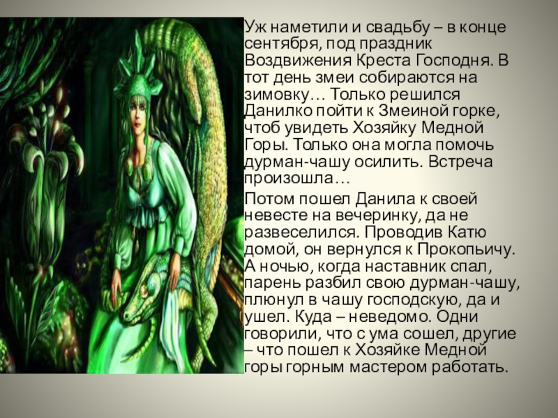 Креста Господня. В тот день змеи собираются на зимовку… Только решился Данилко пойти к Змеиной горке, чтоб увидеть Хозяйку Медной Горы. Только она могла помочь дурман-чашу осилить. Встреча произошла…