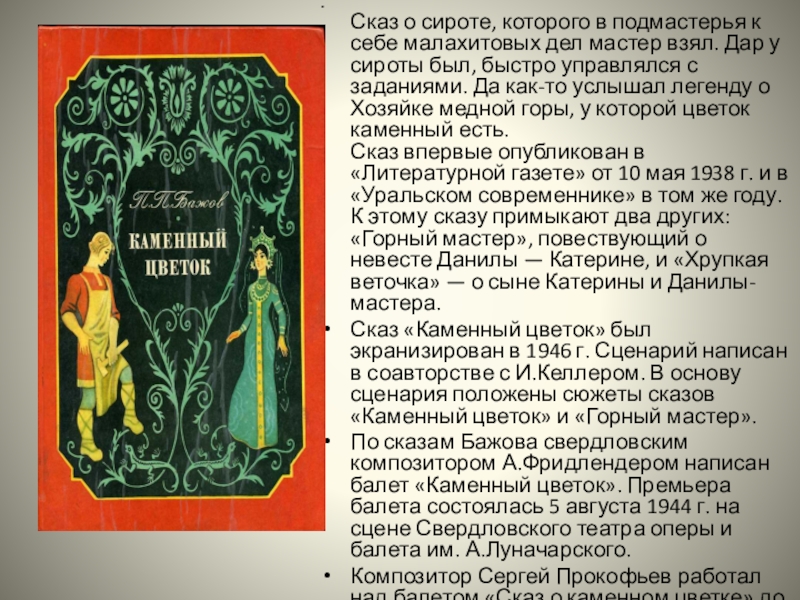 По сказам Бажова свердловским композитором А.Фридлендером написан балет «Каменный цветок». Премьера балета состоялась 5 августа 1944 г. на сцене Свердловского театра оперы и балета им. А.Луначарского.