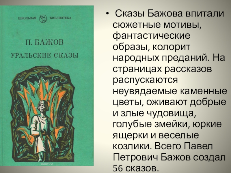 страницах рассказов распускаются неувядаемые каменные цветы, оживают добрые и злые чудовища, голубые змейки, юркие ящерки и веселые козлики. Всего Павел Петрович Бажов создал 56 сказов.