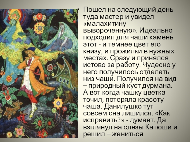 Слайд 13Пошел на следующий день туда мастер и увидел «малахитину вывороченную». Идеально