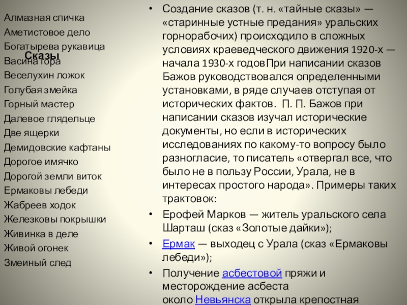 в сложных условиях краеведческого движения 1920-х — начала 1930-х годовПри написании сказов Бажов руководствовался определенными установками, в ряде случаев отступая от исторических фактов. П. П. Бажов при написании сказов изучал исторические документы, но если в исторических исследованиях по какому-то вопросу было разногласие, то писатель «отвергал все, что было не в пользу России, Урала, не в интересах простого народа». Примеры таких трактовок: