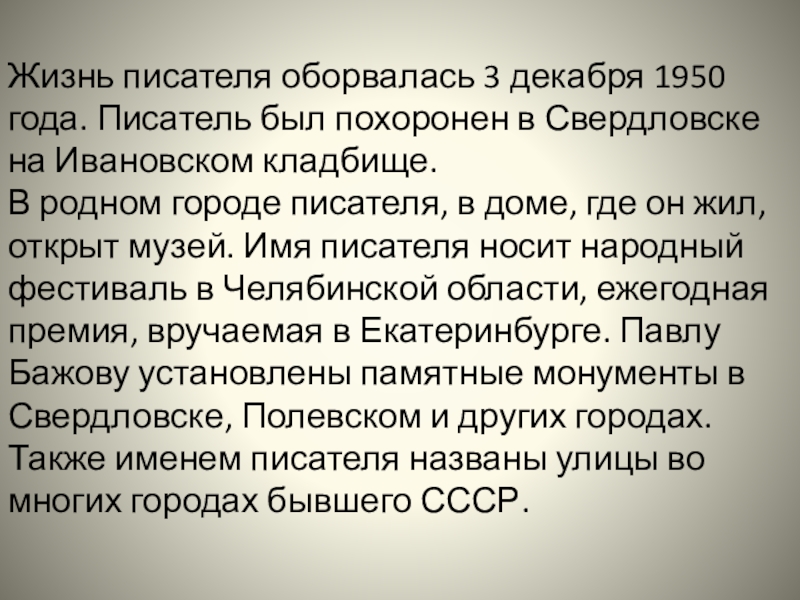 Слайд 20Жизнь писателя оборвалась 3 декабря 1950 года. Писатель был похоронен в