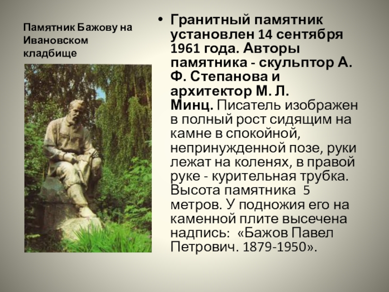 Слайд 22Памятник Бажову на Ивановском кладбище