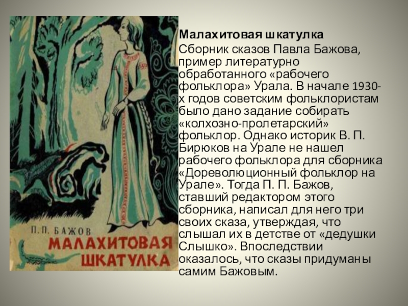 В начале 1930-х годов советским фольклористам было дано задание собирать «колхозно-пролетарский» фольклор. Однако историк В. П. Бирюков на Урале не нашел рабочего фольклора для сборника «Дореволюционный фольклор на Урале». Тогда П. П. Бажов, ставший редактором этого сборника, написал для него три своих сказа, утверждая, что слышал их в детстве от «дедушки Слышко». Впоследствии оказалось, что сказы придуманы самим Бажовым.