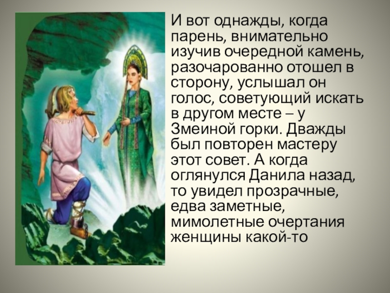в сторону, услышал он голос, советующий искать в другом месте – у Змеиной горки. Дважды был повторен мастеру этот совет. А когда оглянулся Данила назад, то увидел прозрачные, едва заметные, мимолетные очертания женщины какой-то